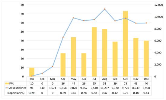 In terms of time period, family medicine journals published 10 COVID-19-related articles as early as January 2020, when the epidemic began to emerge. This accounted for 10.98% of all COVID-19-related articles in PubMed in that month (Figure 2). However, in February and March, there were no relevant published articles. The number of COVID-19-related articles gradually increased until April but was <1% compared with the number of articles published in all disciplines. The number of relevant articles peaked in October with 73 articles, accounting for 17.8% of all the COVID-19-related articles published in family medicine journals for the entire year. Overall, family medicine journals published an average of 34.1 COVID-19-related articles per month.