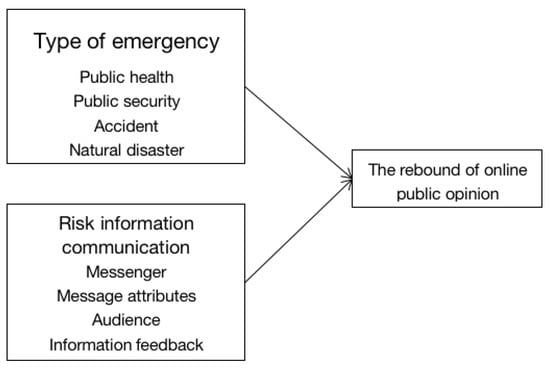 Communication refers to a social relationship between individuals in which messages emanating from one member of the relationship may enable another member to reduce their “uncertainty” [18]. The message must be based on language that refers to various possible discriminations that an individual can make among features of their environment. Schramm pointed out that risk communication is the process of information sharing with others with three basic elements: messengers, message attributes, and audiences [19]. Lasswell summarized the process of information transmission from transmitter to receiver through the media into five elements, namely, communicator, information, media, audience, and feedback [20]. With the development of risk-communication research, attention has been paid to the interaction between information transmitter and information receiver in risk communication. The American Committee on Risk Cognition and Risk Communication proposed that risk communication is a process of interactive debate on risk information among multiple subjects [21]. Risk-information communication on the network is a process in which multiple subjects, such as the government, experts, opinion leaders, and the general public, discuss and exchange views on events in cyberspace [22]. In risk-information communication after the occurrence of a public emergency, a public-emergency meta-event is the starting point of online public opinion and the initial carrier of online public-opinion topics. The meta-event causes different degrees of online discussion and public attention due to different impact scale and damage scope [9]. On this basis, this paper divides the factors that affect the rebound of online public opinion on emergencies into five categories: the type of emergency, messengers, message attributes, audience and information feedback. Figure 2 is the theoretical framework of this paper.