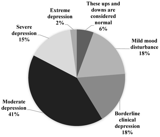 From the total sample population, 41.4% showed moderate depression (45% female vs. 55% male), 15.2% (49% female vs. 51% male) showed severe depression, and 2.2% (48 female vs. 52 male) showed symptoms of extreme depression (Figure 1). There was a significant difference in gender for overall mental wellbeing (F2,22051 = 20.02, p < 0.001, partial η2 = 0.02). Females exhibited moderate depression at 42% vs. 41% for males, borderline clinical depression in females was 17.5% vs. 17.8% for males, and mild mood disturbance in females was exhibited by 16.7% vs. 18.6% for males. Both severe and extreme depression were higher in females than males, at 16.3% vs. 14.5% and 2.3% vs. 2.1%, respectively.
