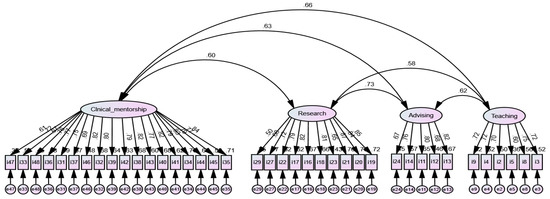 In the EFA’s second phase, the KMO value was 0.92, Bartlett’s test of sphericity revealed that χ2 = 4025.64 (p < 0.001), and MSA ranged from 0.86 to 0.96. The communality of all the 19 items was higher than 0.4 and ranged from 0.40 to 0.77. The factor loading ranged from 0.50 to 0.86. The first factor with 18 items, second factor with 10 items, third factor with 6 items, and fourth factor with 5 items explained 27.31%, 16.55%, 10.12%, and 9.60% of the variance, respectively. Finally, the total explained variance was 63.58% (Table 3). Each factor was provided one of the following labels: “Clinical mentorship (factor 1),” “Research (factor 2),”, “Advising (factor 3)”, and “Teaching (factor 4)” (Table 3).