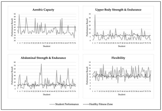 Several U.S. states require an annual state-level mandatory fitness assessment for students in public schools [,]. FitnessGram [] is a widely used assessment instrument to measure student fitness levels through a series of fitness tests. FitnessGram seeks non-competitive fitness assessments using criterion-referenced standards to determine student fitness zones. The benefit of this is that the standards used to determine fitness zones could indicate the risk of chronic diseases later in life. Ideally, the FitnessGram can provide physical education teachers, students, and parents with information on students’ fitness levels, and by extension, be used to build a tailored program of physical activity []. However, despite various health risk factors due to low level of fitness among children, little research has focused on the fitness levels of children in the United States, and even less research has been conducted on student fitness in Title I schools []. Therefore, the purpose of this study was to investigate the health-related fitness levels of Title I elementary school students.