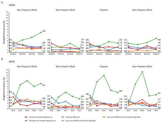 Prevalence of exclusive and dual use of ENDS and menthol/non-menthol cigarettes by race/ethnicity in (A) PATH and (B) NYTS.