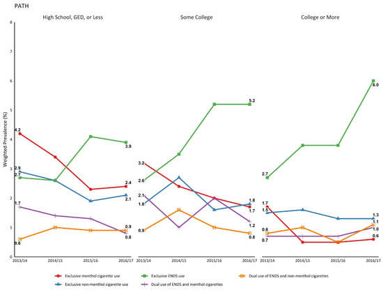 There are several limitations in this study. First, we examined data from 2013 to 2017 because it allowed for better comparability of trends over time for these two surveys. In doing so, we were unable to examine ENDS use classified by menthol and non-menthol flavoring, as data on these measures only became available starting in PATH 2014/15 and NYTS 2016. Furthermore, the years we examined do not fully capture the more recent increases in ENDS use due to the emergence of JUUL and pod-based systems [81,82]. Newer PATH and NYTS data are now available, but only data from 2013/14 and 2016/17 are truly nationally representative in the PATH study. There is attrition in the number of completed interviews by 15–17-year-olds in PATH 2014/15 and PATH 2015/16 that could be attributed to various factors, including nonresponse and more youth aging up into adults than 12–14-year-old youth aging up into the 15–17-year-old category [55]. Weights for PATH 2014/15 and PATH 2015/16 account for attrition and allow for pseudo-cross-sectional analyses, but since they only follow the cohort from PATH 2013/14, there is a possibility that the weighted estimates from these waves are not nationally representative at the time these waves were conducted. Future analyses using more recent nationally representative data are needed to better understand trends in the post-JUUL era. Second, we utilized an inclusive definition of current product use (i.e., product use on at least 1 day in the past 30 days) that is commonly used in studies examining tobacco use among youth [36,83]. This definition made our estimates easily comparable to other studies and allowed us sufficiently large sample sizes to assess differences across sociodemographic subgroups. However, this definition does not distinguish between experimental and established users. Most experimental users will not become established users, which means our current use prevalence estimates are likely overestimating tobacco behaviors that will result in long-term use. Future research would benefit from examining more stringent definitions of tobacco use, focusing on frequent users or established users. Third, in our definition of menthol and non-menthol cigarette use, we classified participants who were missing information about menthol-flavored cigarettes with participants who used non-menthol cigarettes. While it is possible that we overestimated the prevalence of current non-menthol cigarette use and underestimated the prevalence of current menthol cigarette use among youth, we were able to preserve our estimates of overall cigarette use prevalence. Fourth, only PATH contained information about socioeconomic status—we were not able to examine differences in use patterns with NYTS. Fifth, youth tobacco users are more likely to be polytobacco users [65], especially youth ENDS users [84,85]. While this study only examined ENDS and cigarette use, future studies may want to consider examining other tobacco products popular among youth when assessing these trends. Finally, our results are based on cross-sectional data (NYTS) or cross-sectional analysis of longitudinal data in which observations are not independent (PATH). Changes in prevalence do not capture within-individual changes in tobacco product use over time. To directly answer this question, transition analyses on prospective longitudinal data are needed.
