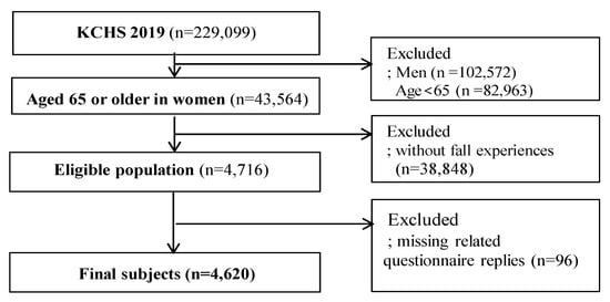 This study was a descriptive research study that used the 2019 Korea Community Health Survey (KCHS) [] to identify the health-related quality of life according to the fall experiences of elderly women. The KCHS was conducted at 255 health centers nationwide, beginning in 2008, for adults aged 19 or older, to produce comparable regional health statistics to formulate and evaluate regional healthcare plans. In order to collect data, trained investigators visited selected sample households, provided explanations for the investigation and confidentiality to the person surveyed, and received consent to participate. One-to-one interviews were conducted using electronic survey computer-assisted personal interviewing.