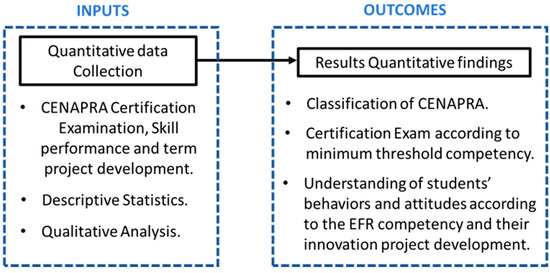 Moreover, Figure 1 shows a block diagram of the sequence of procedures performed to develop the quantitative method to evaluate the EFR competency in students. The figure shows inputs on the left: data collection, EFR evaluation (certification), quantitative analysis on the statistics. In the outcomes, the right side presents the classification level of the CONAPRA certification, as well as the performance of the students in the behaviors and attitudes according to the EFR competency and innovation project development.