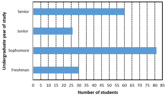 Figure 2 and Figure 3 show bar diagrams with the distribution of students from the sample. Figure 2 illustrates the distribution by semester of study where the number of 3rd semester students dominate, with more than 60. In terms of degree program groups, Figure 3 illustrates that science and engineering students dominate the sample, with more than 110 students.