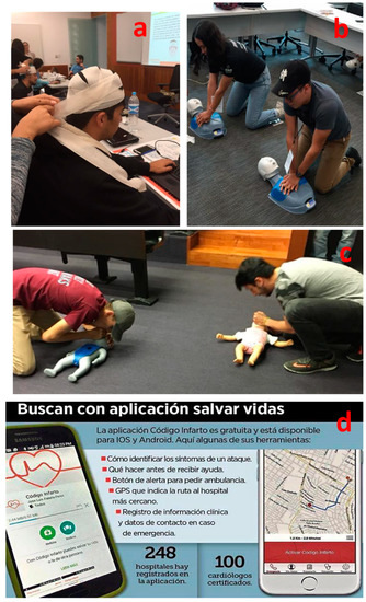 Figure 4a shows a bandages practice; Figure 4b,c describe a CPR training practice and evaluation, and Figure 4d shows a leading application generated during the EFR to save lives using an app for first responders named “codigo Infarto”. This project and developed app were made using both the IOS and the Android platforms. The app shows information on how to identify the symptoms of an attack and what to do before the health professionals arrive. It also includes an alert button to request an ambulance and a GPS that indicates the route to the nearest hospital, and contains a record of clinical information such as emergency contact details.