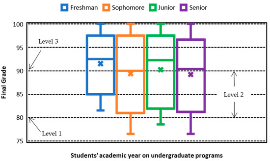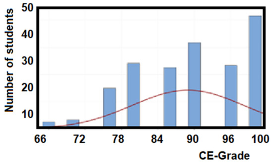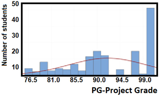 Figure 7 illustrates the combination of both results with a mean value of 90.49/100 in the final-grade and a standard deviation of 5.88, which indicates a higher performance with less dispersion. Additionally, a 95% confidence interval: