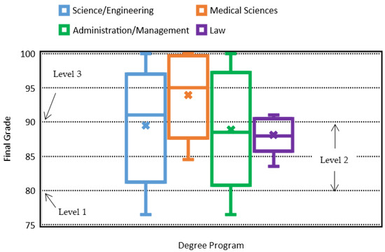 R.Q. 3 What differentiation exists between domain levels, 1, 2 or 3, when students are certified by the final grade that includes the CONAPRA exam to obtain the “emergency first response” competence, and their major discipline of study (science/engineering, administrative/management studies, medical professions, or law)?