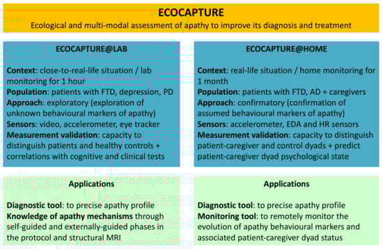 The main objective of ECOCAPTURE@HOME is to validate a measurement method to assess assumed behavioural markers of apathy in everyday-life conditions from data collected in patient-caregiver couples. We will attempt to identify the most fitted measurement model that ensures good psychometric properties (reliability and validity) for the measure of assumed behavioural markers of apathy. More precisely, we will validate two measurement models corresponding to two time-scales: across one month (28 days) and across one day. This will allow us to adjust according to the specific needs of clinicians regarding apathy telemonitoring: either short-term follow-up with daily measures or long-term follow-up with monthly measures.