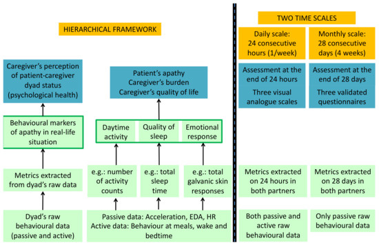 The experimental design, summarised in Figure 2, is built upon the measurement model of the behavioural markers of apathy, presumed to predict the psychological status of the patient-caregiver dyad. Thus, we measure two types of variables on both a daily and a monthly scale: