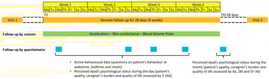 The first global limitation of the study is the risk of high dropout and poor compliance with the protocol in the recruited dyads, especially in patient-caregiver dyads who have to deal with everyday issues related to the patient’s functional difficulties. Solutions will be implemented to maintain motivation in order to limit dropout and poor compliance. Firstly, a support by phone will be offered during the follow-up (two scheduled appointments on the phone with an investigator and possibility to contact him/her if needed). This will constitute an opportunity for the investigator to warn participants in case of poor compliance (the investigator can follow data collection for each couple during follow-up thanks to a dedicated dashboard). Secondly, the financial compensation for taking part in the study will depend on proper compliance with the protocol of the whole 28-day follow-up. Besides, the protocol has been optimized to limit missing data due to poor compliance. Regarding the compliance with the wearing of the sensor bracelet, as participants are supposed to wear it nearly continuously during the follow-up, it should be less likely for them to forget it. Moreover, to avoid technical issues preventing sensor data collection, warning notifications will be sent by the smartphone application when the bracelet battery is low and as soon as the bracelet is disconnected from the app. It may be hard for some individuals with dementia to remember that they have to keep the bracelet on, but we expect that caregivers will help them with bracelet wearing. Regarding the compliance with the filling of questionnaires, notifications will be sent by the application to remind to complete them, and participants will be forced to answer all the questions to be able to send their report. Some questionnaires (those expected at T0 + 28 days) could also be completed at Visit 2 if it has not been done before. In case of missing data due to non-compliance with bracelet wearing and/or questionnaire filling during follow-up, we will try to use the available information as much as possible to contribute to the validation of measurement models on a daily and monthly scale (as long as at least 80% of the total amount of required data has been collected).