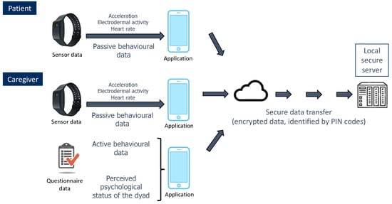 As shown in Figure 3, we collect two types of data: (1) passive behavioural data from sensors, nearly continuously during the four weeks of follow-up; (2) active data from online questionnaires, once a week on a day chosen by the partner who fills the questionnaires (active behavioural data and in patient-caregiver dyads, active data on dyad’s psychological status on a daily scale) and at T0 + 28 days (in patient-caregiver dyads, dyad’s psychological status on a monthly scale).