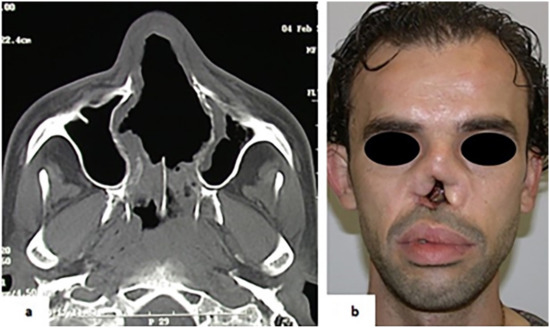 (a) Case 5. Destruction of bony and cartilaginous septum revealed by CT scan. (b) Typical saddle-nose deformities with columellar retraction and nasal collapse.