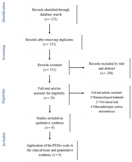 On the other hand, these physiotherapeutic treatments, being supported by clinical trial data, could be a very useful treatment alternative for women with PD [21], particularly those who are not eligible for pharmacological therapy, since physiotherapy has no side effects according to the analyzed studies [20,21]. Many reviews have evaluated the efficacy of exercise [22,23,24,25] or individual physiotherapy interventions for PD [20,26,27,28]. In 2014, one of these reviews determined the efficacy of physiotherapy modalities in the management of pain [20]. However, the efficacy of physiotherapeutic treatment has not been systematically verified in larger and homogeneous samples in randomized controlled trials and long-term follow-up [3,29]. It is important to search for the most recent evidence for physiotherapy in PD, particularly those studies published since Kannan and Claydon’s systematic review (2014) [20], and also including important outcomes in relation to pain intensity. We have updated the scientific literature to date as new trials have been published for the last six years.