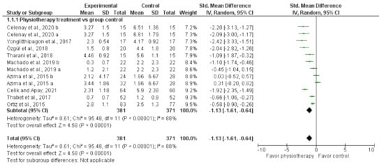 Pooled MD (95% CI) of effect of physiotherapy in pain relief.