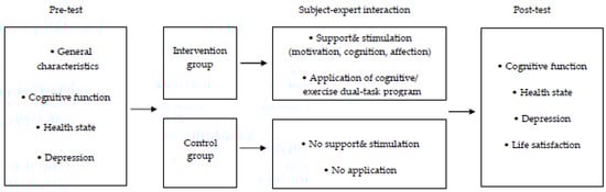 This study was conducted from October 2020 to March 2021. The cognitive/exercise dual-task program for the elderly living in the community was a program consisting of 20 sessions for 10 weeks, and it was conducted through training and education at each session. The experimental intervention was directly applied by the researcher to the intervention group. The researcher is a geriatric nurse specialist with more than 3 years of teaching experience at a university. The program was held in a community center for senior citizens. In the preliminary survey, general characteristics, cognitive function, health status, depression, and life satisfaction were surveyed with a questionnaire for all study participants in the intervention and control groups. The post-survey was conducted immediately after the end of the program in the intervention group. In the control group, at 10 weeks after the preliminary survey, it was conducted in the same manner as the preliminary survey. During the 10 weeks, participants in the control group were living daily in their community. After the 10 weeks, cognitive function, health status, depression, and life satisfaction were measured for all study participants in the intervention and control groups. At this time, it was conducted by the same research assistant who conducted the preliminary survey. After the study finished, the same cognitive/exercise dual-task program was provided for the participants in the control group as an ethical consideration.