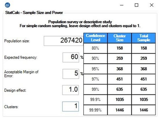 - Centers for Disease Control and Prevention (CDC). Population Survey or Descriptive Study. StatCalc User Guide. Available online: https://www.cdc.gov/epiinfo/user-guide/statcalc/samplesize.html (accessed on 19 May 2021).