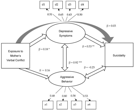 On the other hand, the association from youth exposure to verbal conflict between mother and her intimate partner to youth aggressive behaviors was statistically significant (β = 0.16, p = 0.014). In the two pairs of examined correlations, youth depressive symptoms and youth aggressive behaviors were significantly correlated with each other (β = 0.92, p < 0.001), but youth aggressive behaviors and suicidality were not (β = −0.25, p = 0.16) (see Figure 2).