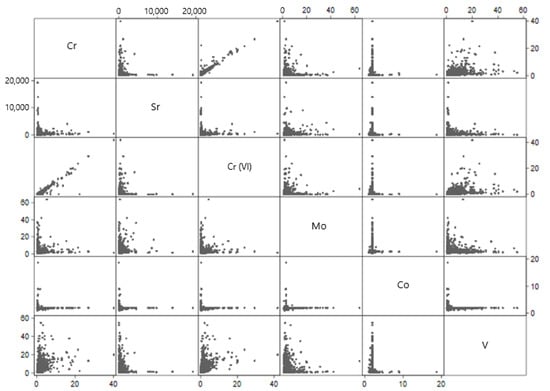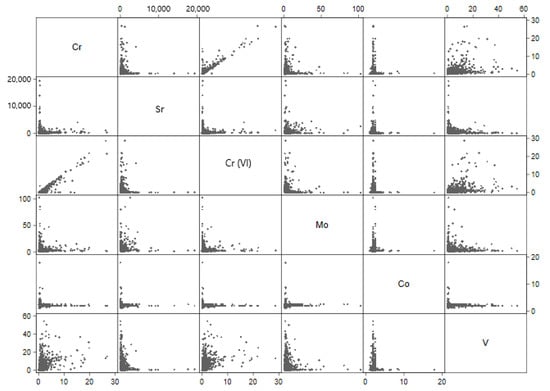 This paper presents an assessment of co-occurring metals in the United States public water systems. To accommodate values below the MRL, we made an inference about the co-occurrence in drinking water systems based on aggregated data summaries (i.e., predicted geometric means of contaminants in each water system). Our finding is therefore vulnerable to potential ecological fallacy in conclusions about contaminant co-occurrence in individual water samples [], and if the contaminants have short biological half-lives in humans from drinking water [,], for toxicologically relevant joint doses of these chemicals. Nevertheless, our finding that vanadium and chromium tend to both be high in the same water systems raises concerns about potential impacts of joint exposure warranting a cumulative risk assessment approach [,] and further targeted investigation into possible human joint exposures. We think our approach resulted in a conservative estimate of the correlations between these six metals at the water system level, as we predicted the geometric means for each chemical separately rather than jointly modeling these contaminants in a multivariate outcome model.