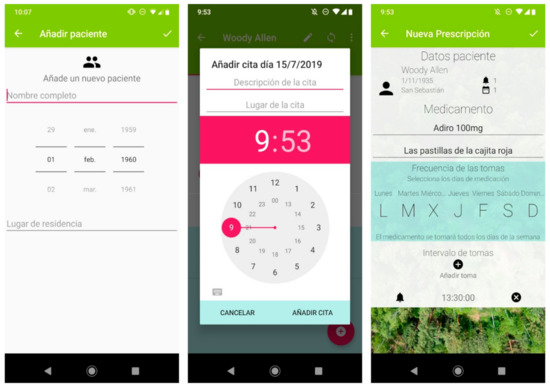 A selection of screenshots from the app. The application allows information on multiple patients to be stored (left panel). It includes a calendar (central panel) where the date, time, location and description of the next medical appointment can be specified. The pharmacological reminder function (right panel) allows the health professional to specify the name of the medicine, a brief personalized description of it, the days on which it is to be taken, and at which times. The application includes a synchronization button for the encrypted transmission of the data to the voice assistant via Bluetooth.