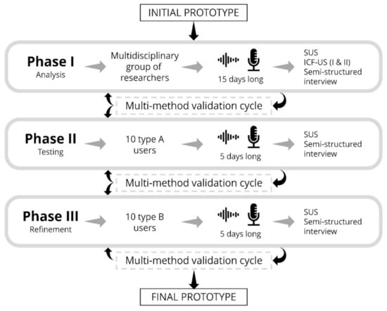 The usability of the system will be evaluated using a combination of distinct but complementary methods that will facilitate a multidimensional evaluation of the prototype. The study will employ observational, descriptive and mixed approaches and, in accordance with the available evidence of previous studies that advocates a cyclical sequence of analysis, prototyping, testing and refinement of the mechanisms of interaction with the user [27,28] will include a usability analysis across several phases, with multiple data collection and monitoring points. In this regard, it is important to emphasize that the progression from one phase to another will be limiting, as the study will not advance to the next stage without having satisfied the control points established in the current phase.