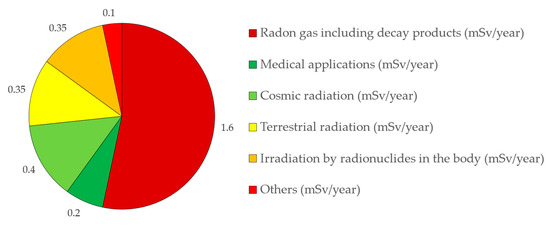 Most people face radiation exposure in their daily lives without being aware of it, comprehending exposure to external natural radiation from sideral space and the Earth, and exposure to internal naturally present radioactive materials, just like those in food and indoor Radon [2]. The principal source of radiation from ionizing sources with natural origins is Radon gas and the subsequent progeny, referred to as its decay products [89]. According to the United Nations Scientific Committee on the Effects of Atomic Radiation (UNSCEAR), the inhalation of Radon and progeny elements corresponds to a dose along the year that represents most of the exposure to natural origins [90]. According to the graph presented in Figure 3, Radon gas including its decay products is the most representative origin of exposure of the world population to ionizing radiation [91]. Overall, natural radiation represents about a 60% annual dose that affects people, and medical practices represent about 40% of the remaining dose.