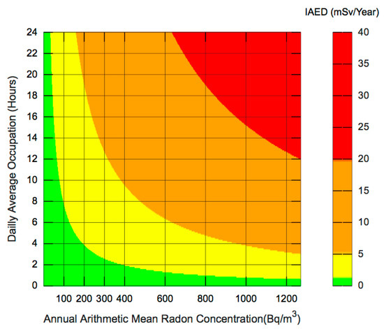 Figure 4 depicts the IAED as a function of the AAMRC and the Daily Average Occupation (DAO), cf. Equation (2), in the interval between 0 and 1270 Bq·m−3, and 0 to 24 h, respectively.