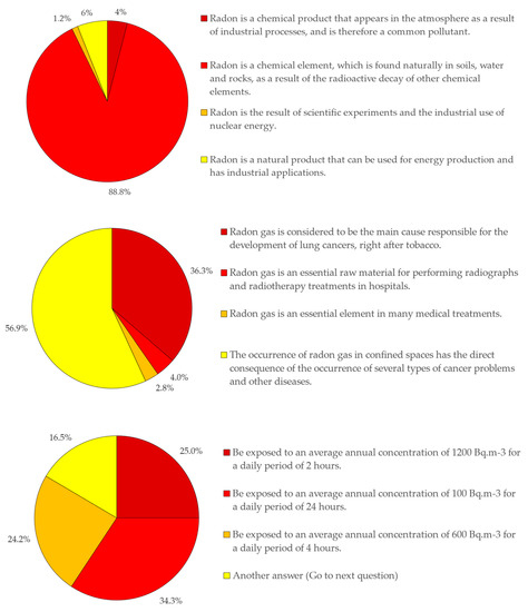 The survey was active during the period from 5 January to 16 March 2021, with a total of 873 valid responses. This set, considering a population of 6 million individuals, corresponding to the Portuguese users of the social networks FACEBOOK and LINKEDIN, for a degree of confidence of 95%, allows calculation of a margin of error for the survey carried out, as being 3%. In other words, this margin of error, or confidence interval, allows the affirmation that the results of this survey represent the real opinions of the population since the error is only 3%. Of the results obtained, 17.4% correspond to the age range equal to or below 20 years old, 25.2% correspond to the age range between 21 and 30 years old, 14.4% correspond to the age range between 41 and 50 years old, 17.1% correspond to the age range between 51 and 60 years old, 4.2% correspond to the 61 and 70 years old age range, and 0.6% correspond to the equal or older than 71 years old age range. As can be seen from the results obtained, the levels corresponding to young adults and adults present a higher participation rate, totalizing 78% of the total of respondents, which is in line with the results presented for studies carried out with similar tools, as described in the studies conducted by Lange et al. (2017) and Moretti et al. (2020) [112,113]. Concerning the gender of the respondents, the distribution shows a tendency towards an equal division among the respondents, with the male gender presenting a slight increase, with 52%, while the female gender represents 48% of the total responses. This result is also in line with previous studies, where male participation presents slightly higher values, although there is currently a trend towards the approximation between genders. Regarding the educational qualifications of the sample, there is a distribution of 17.7% for those who attend or hold complete secondary education, 3.9% for those who attend or hold technical–vocational courses, 17.7% for those who attend higher education, 22.5% for graduates, 14.7% for holders of a master’s degree and 23.1% for those with a doctorate. As can be seen, the level of academic qualifications presented by the sample, showing 78.5% of respondents with university qualifications, including those with a doctorate, the highest, does not represent the level of qualifications of the Portuguese population. In fact, according to the indicators presented on the PORDATA platform, which provides statistical data on Portugal, the percentage of individuals of both genders, aged between 18 and 64 years old is 25.4%. However, the fact that Portuguese public and private higher education entities were asked to distribute the survey by their email lists justifies this higher level of academic qualifications presented in the study. Based on the results obtained, and despite the high level of academic qualifications presented, there is a high degree of ignorance on the topic, as will be seen in the results obtained in the survey responses (Figure 6). Concerning the geographical distribution of the origin of the answers, those originated from all districts of mainland Portugal, but also in the autonomous regions of the Azores and Madeira. It was also found that the districts that provided the largest number of responses were those that, in some way, are related to the occurrences of Radon, more specifically, the districts of Viana do Castelo, Braga, Porto, Vila Real, Viseu, and Guarda, on the mainland, and the district of Angra do Heroísmo, in the autonomous region of the Azores. This participation from these districts may be related to the fact that the theme is more widespread, as these are regions presented in the Radon Map, carried out by ITN—Instituto Tecnológico e Nuclear, integrated into IST—Instituto Superior Técnico, corresponding to the areas of greatest incidence.