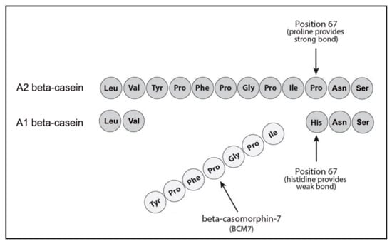Bovine beta-casein is categorized into two broad types, these being A1 and A2, with the A1-type being fundamental to the release of bBCM7 (Figure 1). This bBCM7 peptide is located at positions 59–66 of the 209 amino acids contained within the bovine beta-casein protein [21]. In A1 beta-casein, the release of bBCM7 is facilitated by the presence of histidine at position 67, with the C-terminus bond between positions 66 and 67 being readily broken by carboxyl peptidases such as elastase [25]. In contrast, in A2 beta-casein, the amino acid at position 67 is another proline, leading to preferential cleavage of the longer peptide bBCM9 and creating a major constraint to formation of bBCM7 during in vivo digestion [21]. Although bBCM9 is itself also an opioid with consequent potential pharmacologic properties, these properties are fundamentally different, and bBCM9 is considered a potential beneficial bioactive carrying both antihypertensive properties [26] and antioxidant properties [27]. Additionally, in contrast to A1 beta-casein and bBCM7, no digestive differences have been recorded when A2 beta-casein digests containing bBCM9 are tested with and without naloxone [28]. Human-based in vivo data on beta-casein metabolism to casomorphins and intermediate peptides has been summarized within a systematic review of digestive effects undertaken by Brooke-Taylor and colleagues [22].