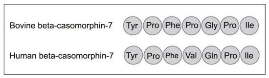 There is also a human version of beta-casomorphin-7 with the structure tyrosine–proline–phenylalanine–valine–glutamine–proline–isoleucine, denoted here as hBCM7 (Figure 2). However, the human version of BCM7 is a much weaker opioid than the bovine form [32]. It is found mainly within colostrum and early lactation-stage milk [33] and it has been postulated to play a role in bonding of baby to mother. It is also much more susceptible than bBCM7 to internal cleavage by peptidases given the internal phenylalanine–valine–glutamine sequence. The specific mechanisms leading to hBCM7 in early-stage breast-milk remain to be fully elucidated. However, it is clear that hBCM7 is released in much smaller quantities than is the case with bBCM7 in most commercial milks, with this being entirely logical given that human beta-casein is of the A2 type.