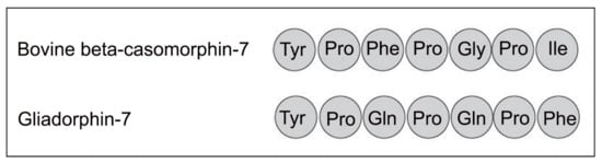 The key gliadin peptide of opioid significance and where issues align with the casomorphins is gliadorphin-7, also often termed gliadomorphin and gluteomorphin. The amino-acid structure is tyrosine–proline–glutamine–proline–glutamine–proline–phenylalanine, and for simplicity this peptide is hereafter termed GD7. Key features in common between GD7 and bBCM7 are the Tyr-Pro at the N-terminus and two further proline amino acids in close succession thereafter (Figure 3). These features, as with bBCM7, will ensure opioid characteristics plus resilience to degradation of GD7 from the C-terminus. However, homology only extends to four of the seven amino acids in total, leading to the potential for considerable differences in specific opioid characteristics. As with bBCM7, shorter peptides deriving from GD7 are unlikely to be of importance within natural in vivo settings given the resilience to degradation from the C-terminus. However, given the diversity of gliadin proteins within the Triticeae, there is potential for other specific gliadorphin structures to be identified.