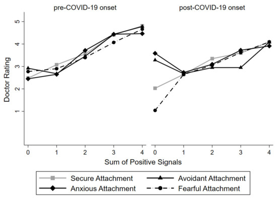 Figure 1. Attachment orientations and doctor rating by signal (pre-and-post the onset of COVID-19). Note: positive signals = sum of displayed high conditions (i.e., picture, ranking of medical school, number of previous patient comments, previous patient rating); secure attachment = low anxious and avoidant; anxious attachment = high anxious/low avoidant; avoidant attachment = low anxious/high avoidant; fearful attachment = high anxious/high avoidant); n = 330 (pre-onset of COVID-19), 223 (post-onset of COVID-19).