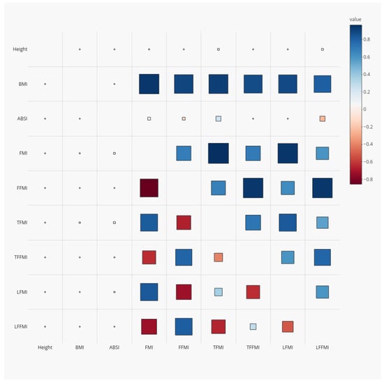 To better understand the interrelation of basic anthropometrics and body composition, correlations were calculated between the Z scores of the different indices listed above. ABSI and BMI are defined so that the correlation between them is close to zero []. Following the same approach, allometrically adjusted forms of the body composition indices can be found that have close to zero correlation with BMI and ABSI by first finding the least-squares coefficients for the linear regression
