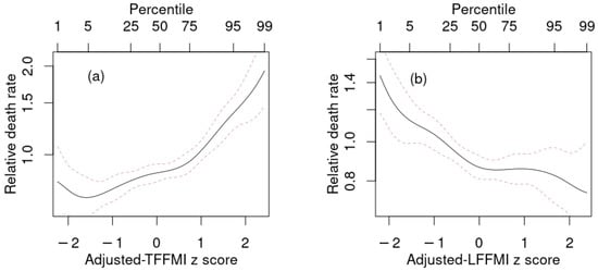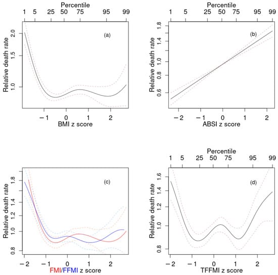 The anthropometric and body composition Z scores, used as predictors, could enter into the mortality hazard models either linearly or nonlinearly. For a linear predictor, each unit increase in its Z score would increase or decrease the logarithm of mortality hazard by a constant amount. For a nonlinear predictor, the logarithm of mortality hazard would be shifted by an arbitrary smooth function of the Z score, expressed using a penalized spline basis, with corrected AIC being used to choose the function’s complexity [,,]. Of the anthropometric and body composition predictors considered here, ABSI was entered into each model as a linear predictor, since it has previously been shown that the logarithm of mortality hazard has a near-linear dependence on the ABSI Z score [,], while BMI and the body composition indices were entered as nonlinear predictors to allow for the possibility of, for example, U-shaped associations with mortality risk.