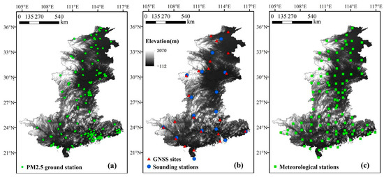 Figure 1. Distribution of observation stations. GNSS: global navigation satellite system. (a) PM2.5 ground station, (b) GNSS sites and Sounding stations, (c) Meteorological stations.