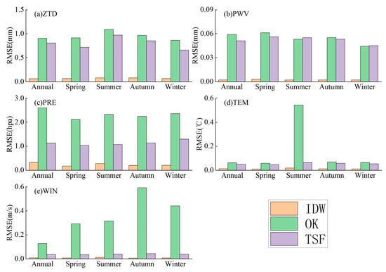 Figure 2. Interpolation effect comparison: (ae) Results of root mean square error of three interpolation methods (IDW, OK, TSF) for interpolating five variables (ZTD, PWV, PRE, TEM and WIN) respectively. Note: DEM means the elevation values obtained from the digital elevation model, WIN means wind, PRE means pressure, TEM means temperature, ZTD means zenith tropospheric delay, PWV means precipitable water vapor, IDW means inverse distance weighting, OK means ordinary kriging, TSF means the tension spline function.