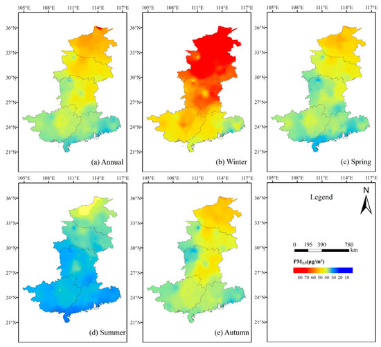 Figure 3. Distribution of PM2.5: (a) Annual, (b) Winter, (c) Spring, (d) Summer, (e) Autumn.