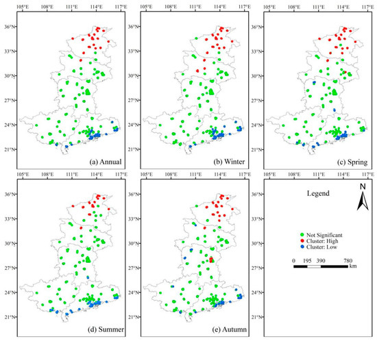 Figure 4. Clusters of PM2.5: (a) Annual, (b) Winter, (c) Spring, (d) Summer, (e) Autumn.
