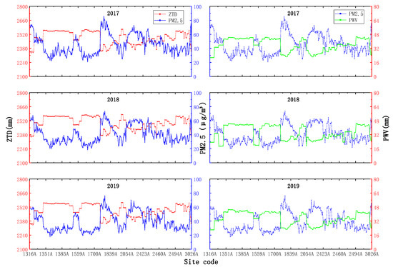 Figure 5. Annual average scale ZTD, PWV and PM2.5 changes.