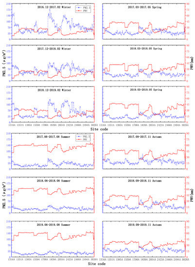 Figure 7. Seasonal average-scale PWV and PM2.5 changes.