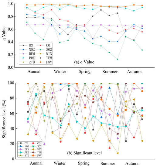 Figure 9. Variable correlation degrees: (a) q values, (b) significant levels.