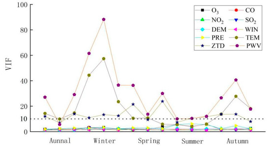 Figure 10. The results of the multicollinearity test. Magnitude of VIF (variance inflation factor) values for O3, CO, NO2, SO2, DEM, WIN, PRE, TEM, ZTD and PWV at different time stamps. Note: DEM means the elevation values obtained from the digital elevation model, WIN means wind, PRE means pressure, TEM means temperature, ZTD means zenith tropospheric delay, PWV means precipitable water vapor.