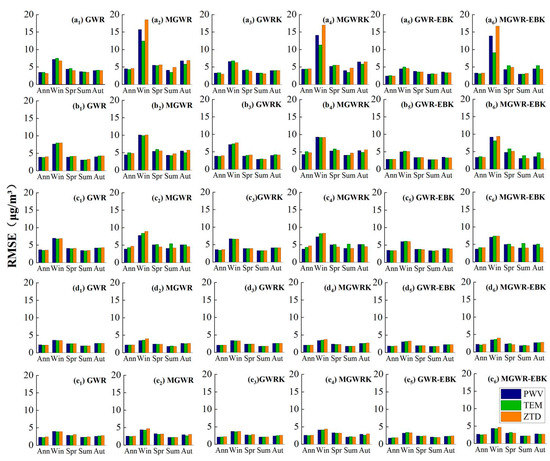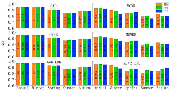 Although both types of models, GWR and MGWR, have performed well in previous spatial studies of PM2.5, as described above, strong spatial heterogeneity and spatial nonstationarity exists in PM2.5 distributions, and it is difficult for the above-mentioned models to handle or simultaneously handle these two PM2.5 distribution characteristics. Therefore, to improve the interpolation of PM2.5 concentration values, we compare the changes induced by the differences in each time scale and spatial scale to the model interpolation effect, fully consider the variations in GNSS-derived ZTD and PWV, and two models, the kriging and empirical Bayesian kriging models, are introduced to eliminate the effect of residual spatial correlations on the fitting of the GWR and MGWR models, thus improving the interpolation accuracy.