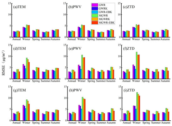 Figure 13. Model RMSEs for different elevation intervals: (ac) ≤35 m, (df) 35–90 m, (gi) ≥90 m.