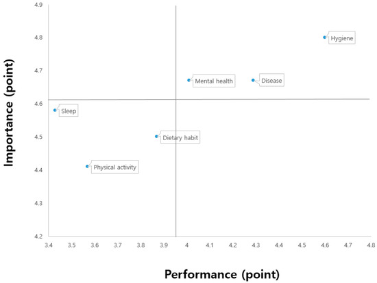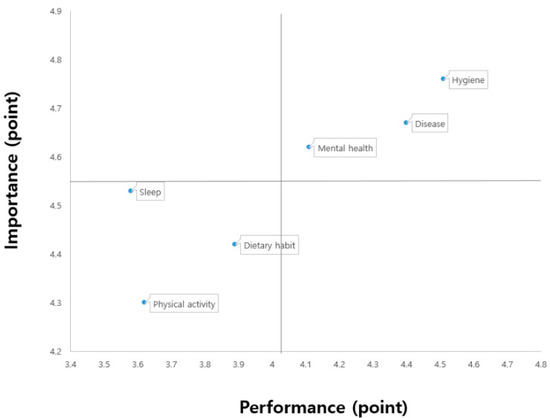Second, hygiene, disease, and mental health management were shown in quadrant I (keep up the good work) in both the student groups, while physical activity, sleep, and dietary habit management were in quadrant III (low priority). However, none of the factors were located in quadrants II (concentrate here) or IV (possible overkill), suggesting that there was no difference in health awareness between the two groups. In a previous study on the importance and performance of health awareness in adolescents, Lee, So, and Youn [21] demonstrated that hygiene and disease management were in quadrant I, while mental health, physical activity, sleep, and dietary habit management were in quadrants II and III, respectively. These findings support the results of the present study.