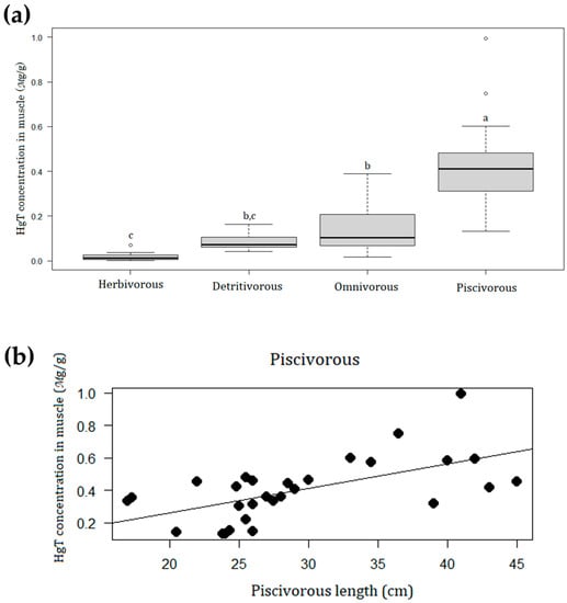 (a) Concentrations of mercury total (µg/g) in the muscle tissue of fish sampled (n = 88) compared among different trophic levels. Median (darker line in the box plot), minimum and maximum values (vertical lines), and outer lines of boxplot (25% and 75%). Dunn test: a > b > c, p < 0.05. Circles are outliers. (b) Linear regression between standard length (cm) of piscivorous fish (n = 29) and the concentration of mercury total (µg/g) in the muscle tissue of fish (y = −0.041 + 0.0151X; R2 = 0.36; F = 15.4; df = 27; p = 0.0005). One individual of Piranha-preta (Serrasalmus rhombeus) was excluded from the analysis to maintain normality and homogeneity of variances.