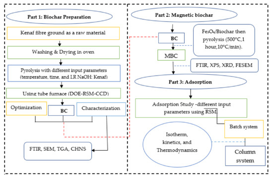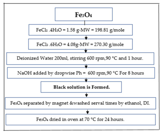 Magnetic biochar was synthesized by incorporating Fe3O4 nanoparticles. It was precipitated using methods employing ferric chloride (FeCl3.6H2O) and ferrous chloride (FeCl2.4H2O) with a ratio of 2:1, according to a protocol summarized in Figure 3 [61,62]. Subsequently, the prepared Fe3O4 was mixed with kenaf biochar and added into 150 mL deionized water before being agitated for 45 min. This composite was sonicated and evaporated to dryness in a water bath for three hours at a constant temperature (100 ℃).