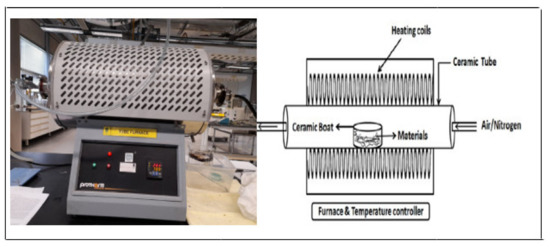 The raw kenaf fiber was washed continuously with distilled water to remove the impurities and dust from its surface, followed by drying in an oven at 105 ℃ for 24 h. The dried sample was crushed to the desired mesh size of 0.5 mm by passing through the respective sieves (Vibratory Sieve Shaker AS 200 Digit cA Model). It was then stored in an airtight container at room temperature before use. Kenaf biochar was prepared by slow pyrolysis. The preparation parameters were preoptimized at pyrolysis temperature of 550 ℃, 180 min reaction time, and 1:1 impregnation ratio with sodium hydroxide using tube furnace shown in in Figure 2 [60].