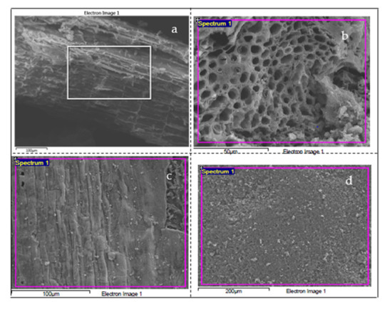 Figure 5 illustrates the SEM images of raw kenaf, the biochar, and the magnetic biochar, as well as the magnetic biochar after adsorption. When compared to raw kenaf, the morphology of the biochar changed. The biochar SEM image in Figure 5b reveals micropores, macropores, and mesopores in several shapes. The biochar had a honeycomb-like morphology, with cylindrical holes intertwined with several big holes [70]. Many pore mouths in ordered manner can be seen over the surface of the biochar. The biochar was then subjected to magnetism and took on new shapes, indicating that surface modulation improved the textural properties and made it possible for Fe to adsorb onto the surface. The magnetic biochar SEM image (Figure 5a,d) shows particles trapped on the surface with plate-like roughness and distorted morphology containing sharp edges and corners, as seen in Figure 5c,d, as opposed to pristine biochar and raw kenaf, because the iron particles were filled in within the pristine biochar matrices which indicated good mechanical bounding [71].